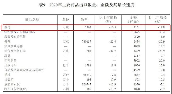2020年,我國出口鋼材5367萬噸,比上年降低16.5%,金額為3151億元,比上年降低14.8%。
