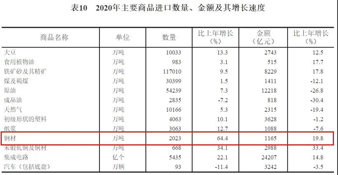 2020年,我國進口鋼材2023萬噸,比上年增長64.4%,金額為1165億元,比上年增長19.8%。