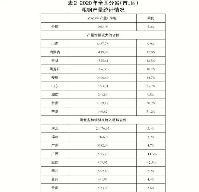 從2020年全國分省(直轄市、自治區)粗鋼產量統計來看,大量存在鋼材凈流出區域的省(直轄市、自治區)粗鋼產量同比大幅增長的現象,反映出國內鋼材市場在生產和消費上的不匹配。而這些省(直轄市、自治區)應該成為控制粗鋼產量的重點限制區域。(見表2)