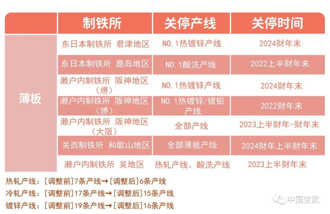 關停部分東日本制鐵所君津地區熱鍍鋅產線和鹿島地區的酸洗產線,將生產集中到君津地區的其他生產線和名古屋制鐵所等生產線。