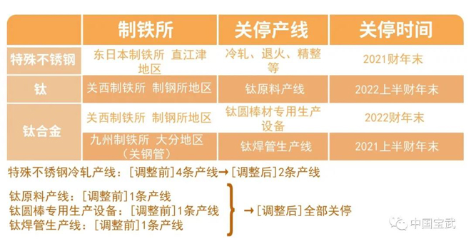 同時,為了提高鈦生產工藝效率,除了關停已經公布的關西制鐵所制鋼所地區鈦圓棒材專用生產設備、九州制鐵所大分地區(光鋼管)鈦焊管生產線外,還將關停關西制鐵所制鋼所地區的鈦原料產線。