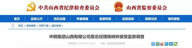 中鋼集團山西有限公司原總經理楊曉林涉嫌嚴重違法,經山西省監委指定,目前正接受太原市監委監察調查。