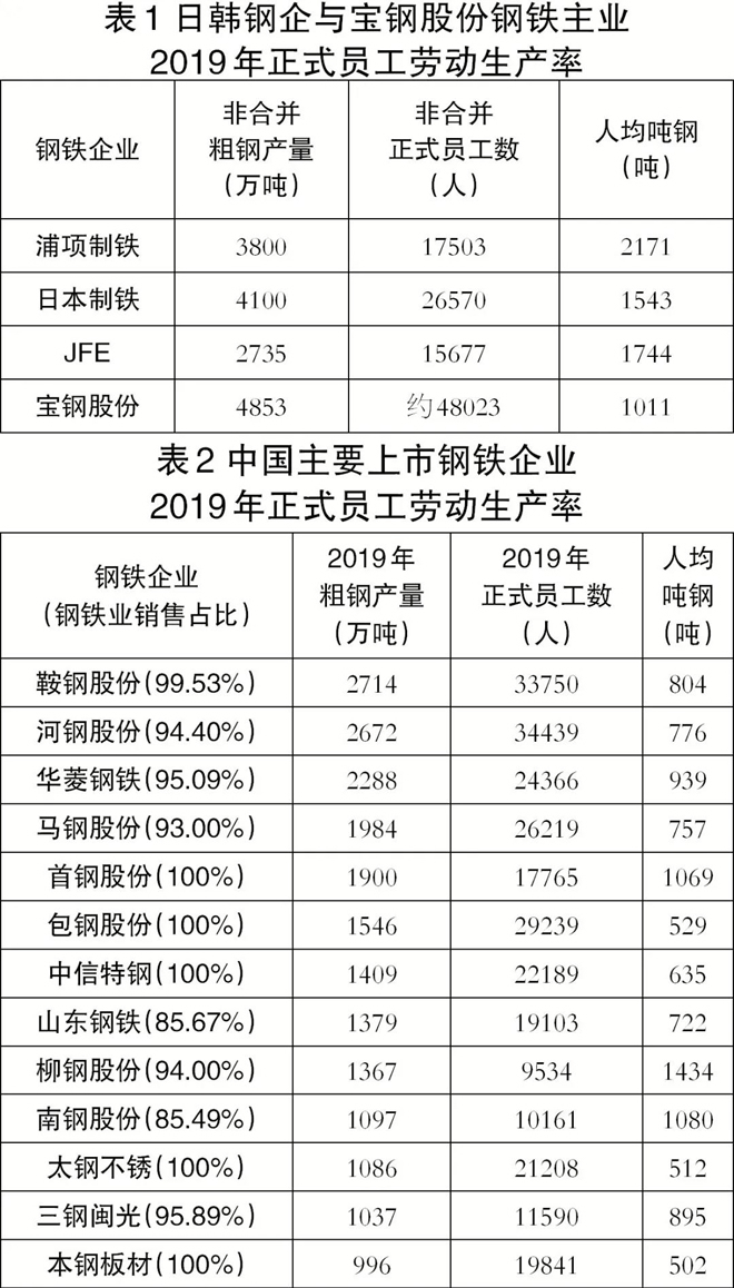 因鋼鐵企業(yè)外協(xié)員工數(shù)一般不對外公布,僅能根據(jù)公開發(fā)布的信息整理出國內外部分鋼鐵企業(yè)正式員工的勞動生產(chǎn)率。由于歷史原因,從長流程扁平材鋼鐵企業(yè)情況來看,中國鋼鐵企業(yè)勞動生產(chǎn)率水平相比日韓鋼鐵企業(yè)還是較低的。據(jù)近日中國鋼鐵工業(yè)協(xié)會發(fā)布的鋼鐵行業(yè)人力資本競爭力(組織效能)指數(shù)中披露的數(shù)據(jù),2019年中國鋼鐵企業(yè)勞動生產(chǎn)率最高達到1641.8噸鋼/人?年,與浦項制鐵相比還有距離。具體見表1和表2: