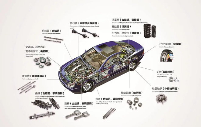 據粗略統計,生產1輛汽車的原材料中,鋼材所占的比例在72%~88%。從鋼材的品種來看,汽車用鋼涉及齒輪鋼、軸承鋼、彈簧鋼(含扁鋼)、合結鋼、合金鋼、非調質鋼、耐熱鋼、易切削鋼、冷鐓鋼、碳結鋼等10余個品種。