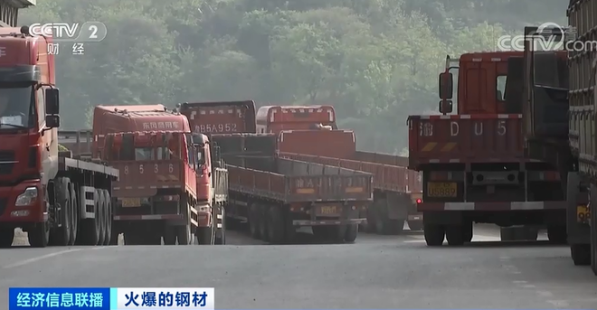 鋼材產品的量價齊升,帶動了鋼貿市場的交易火熱,為了能早點兒提到貨,市場倉庫門前拉貨的卡車甚至排起了長龍。