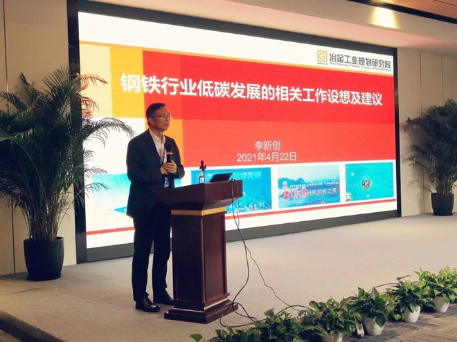 圖為中國鋼鐵工業協會副會長,冶金工業規劃研究院黨委書記李新創在作題為《鋼鐵行業低碳發展的相關工作設想及建議》的報告