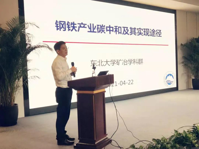 圖為東北大學低碳鋼鐵前沿技術研究院院長儲滿生作題為《鋼鐵產業碳中和及其實現途徑》的報告