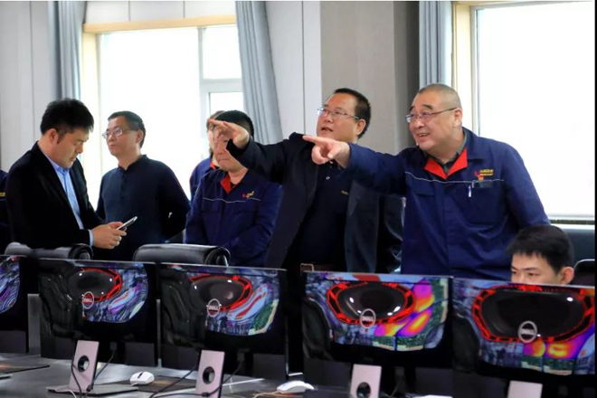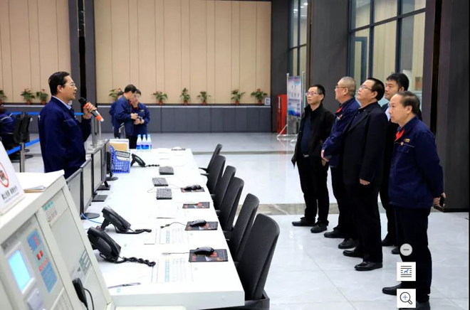 圖為陳玉千一行調(diào)研晉南鋼鐵1860立方米高爐加氫冶煉工藝。