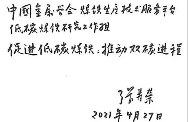 中國寶武集團、中國工程院張壽榮院士為中國金屬學會煉鐵生產技術服務平臺成立“低碳煉鐵研究工作組”,題詞勉勵。鼓勵全行業鋼鐵冶金和煉鐵工作者要努力“促進低碳煉鐵、推動雙碳進程”。