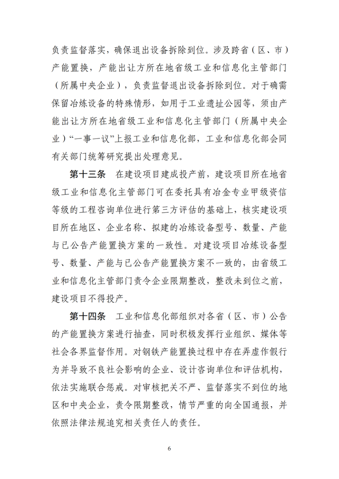 為有效避免“批建不符”,特別是“批小建大”等違法違規(guī)行為,在建項目投產前,建設項目所在地省級工業(yè)和信息化主管部門應核實建設項目的設備型號、數量、產能等信息,與已公告產能置換方案的一致性。根據工作需要,也可委托具有冶金專業(yè)甲級資信等級的工程咨詢單位進行評估。對于批建不符擴大產能的行為,由省級工業(yè)和信息化主管部門責令企業(yè)限期整改,整改未到位之前,建設項目不得投產。
