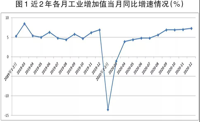 國家統計局按月發布2月~12月份每月工業增加值累計增速、3月~12月份每月工業增加值當月增速。從工業增加值當月同比角度看(1月、2月份工業增加值當月同比用1月~2月份累計同比表示),2020年1月~2月份工業增加值增速大幅下降至-13.5%,3月份增速收窄至-1.1%;自4月份起,各月份工業增加值當月同比轉為正增長,且工業增加值當月同比增速呈現逐月擴大的態勢,如4月份工業增加值當月同比增速為3.9%,此后逐月上升,12月份上升至7.3%(見圖1),為2020年工業增加值當月同比的最高值。