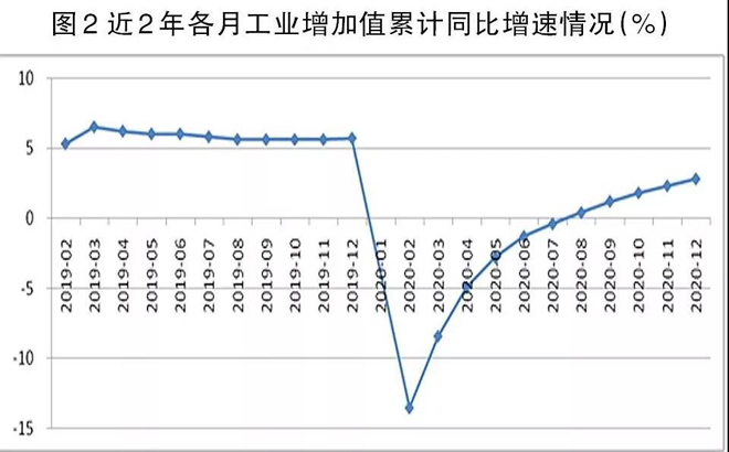 從工業增加值累計同比角度看,2019年各月累計增速的高點出現在3月份,為累計同比增長6.5%,此后連續多月回落,8月~11月份均為5.6%,較3月份回落了0.9個百分點。2020年2月~7月份,工業增加值累計同比為負增長,但降幅逐月收窄,7月份增速已收縮至-0.4%;8月份起,工業增加值累計同比實現正增長,且增幅逐月擴大,12月份累計同比提高至2.8%,但依然較2019年下降了2.9個百分點(見圖2)。這表明,整個工業經濟雖然在下半年呈現出良好的發展態勢,但由于2020年第一季度工業增加值降幅過大,導致2020年工業增加值增速較2019年有一定差距。