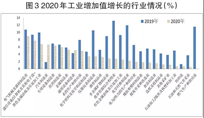 2020年有26個大類工業行業增加值實現正增長(其中燃氣生產和供應業增速為0),而2019年41個大類工業行業增加值全部為正增長,據此可初步判定2020年工業增加值增長結構要弱于2019年。