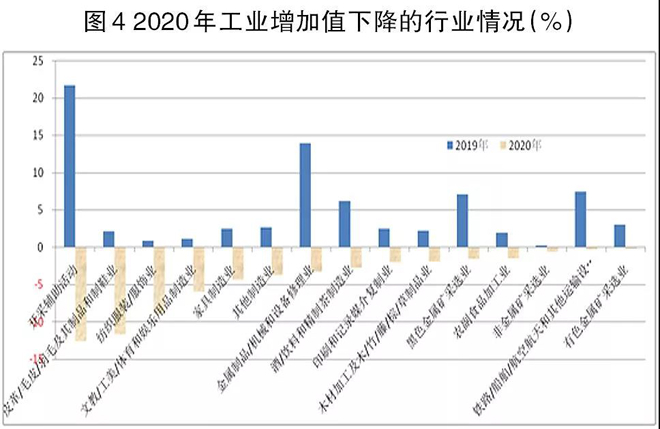 通過對行業的代表性產品屬性進行比較,筆者將15個增加值負增長行業分為4類。第一類是采礦業,涉及有色金屬礦采選業、非金屬礦采選業、開采輔助活動3個行業;第二類是設備制造業,僅涉及鐵路/船舶/航空航天和其他運輸設備制造業、金屬制品/機械和設備修理業2個行業;第三類是能源動力行業,僅涉及燃氣生產和供應業;第四類是以居民消費品生產為主的行業,即傳統的輕工行業,涉及紡織服裝/服飾業、皮革/毛皮/羽毛及其制品和制鞋業等9個行業。上述現象表明,2020年受新冠肺炎疫情影響,社會居民消費增長受到抑制,從而逆向傳導至社會消費品生產行業,導致這些產業綜合產量出現了下降。