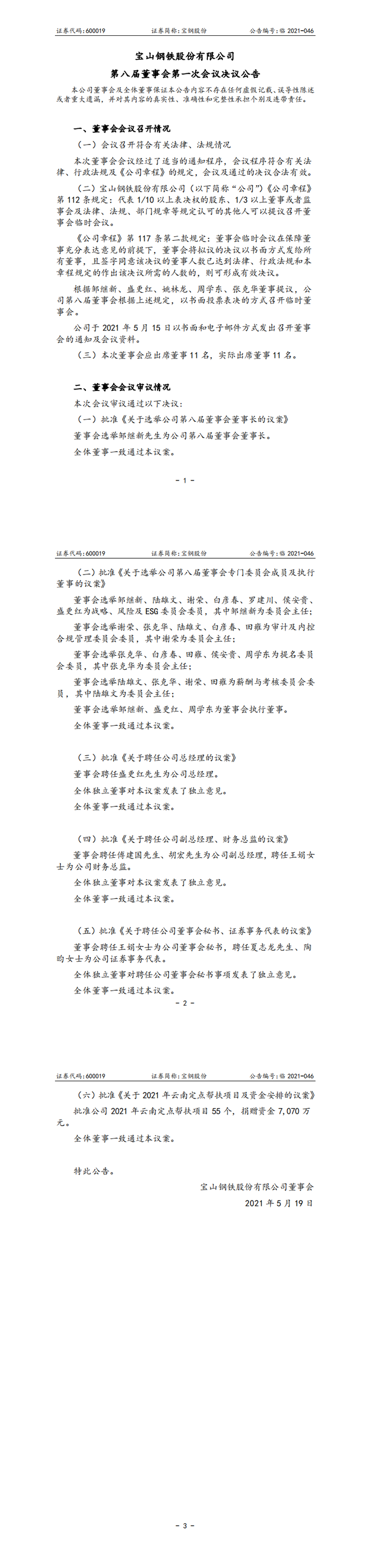 寶鋼股份發布的《第八屆董事會第一次會議決議公告》顯示,寶鋼股份董事會選舉鄒繼新為公司第八屆董事會董事長;選舉鄒繼新、盛更紅、周學東為董事會執行董事。董事會聘任盛更紅為公司總經理,聘任傅建國、胡宏為公司副總經理,聘任王娟為公司財務總監、董事會秘書,聘任夏志龍、陶昀為公司證券事務代表。