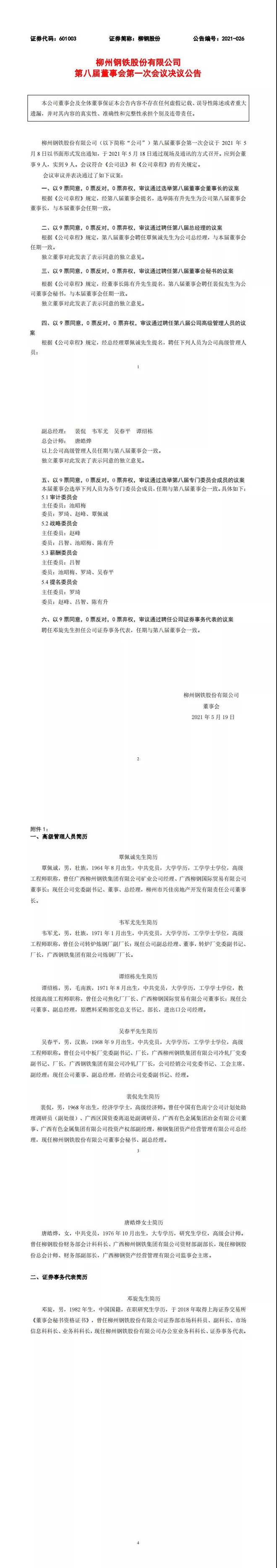 柳鋼股份發布的《第八屆董事會第一次會議決議公告》顯示,選舉陳有升為公司第八屆董事會董事長,聘任覃佩誠為公司總經理,聘任裴侃、韋軍尤、吳春平、譚紹棟為公司副總經理,聘任唐皓燁為公司總會計師,聘任裴侃為公司董事會秘書,聘任鄧旋擔任公司證券事務代表。