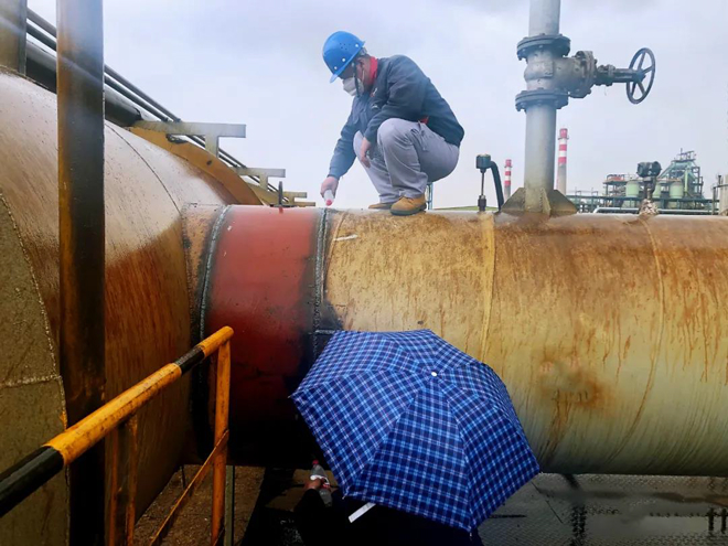 設(shè)備年修中,員工冒雨檢修管理的漏點(diǎn),并進(jìn)行相應(yīng)補(bǔ)焊