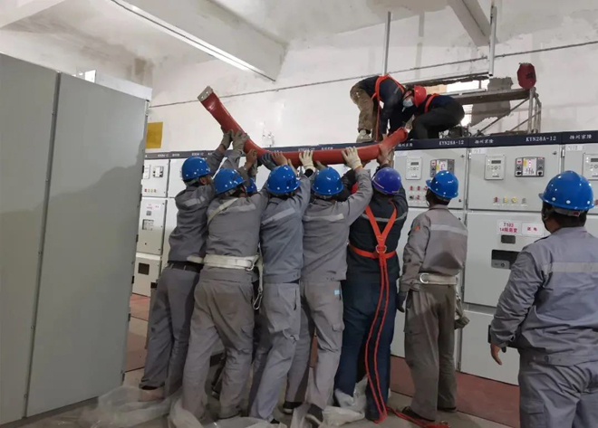 設(shè)備年修中,能源中心的員工正在合力更換配電柜的進(jìn)線端