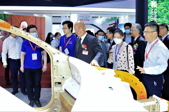 在引導員的帶領下,何文波一行來到了這次展覽會最大展位——展位占地面積達510平方米的中國寶武展臺。首先映入眼簾的就是靚麗的白車身。何文波撫摸著白車身自豪地說道,中國寶武負責了白車身的所有面板,所有材料都用上了,中信泰富特鋼則負責了車體內部變速箱、凸輪軸等零部件用鋼。“這都是寶貴的財富?!彼Φ?。