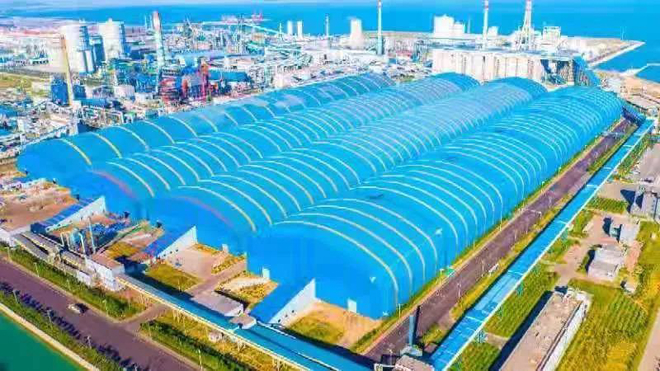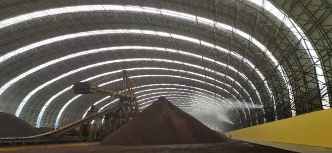 在人們的印像中,傳統的大宗原燃物料場一般露天堆放,遇到刮風天氣,更是塵土飛揚,周圍幾百米的地方都會深受其害。如今走近山鋼日照公司煉鐵廠原料大棚,你會發現35米高、100米凈跨、600多米長的全封閉網架廠房高大壯觀,大棚東西兩端深藍色、棚體是淡藍色,藍白相間,視覺沖擊強烈。大棚內部整潔有序:廠房中間是堆積如山的原料,8個大功率霧炮及時對料堆噴霧降塵;四周是淡黃色圍墻,鮮艷奪目,四周地面是潔凈照人的綠色通道,黃綠相映,給人一種潔凈舒適的感受。