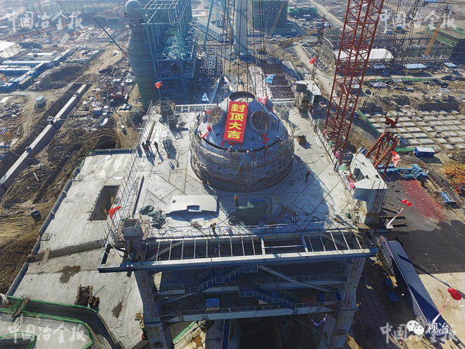 2016年11月24日9時56分,山鋼集團日照鋼鐵精品基地項目建設的標志性工程——煉鐵工程1號5100立方米高爐開始封頂(如圖)。20分鐘之后,重達95噸的煤氣封罩起吊后穩穩就位在高爐爐殼頂部。這個被譽為“齊魯第一爐”的高爐順利封頂,提前37天完成年度計劃節點。(游建平 攝)