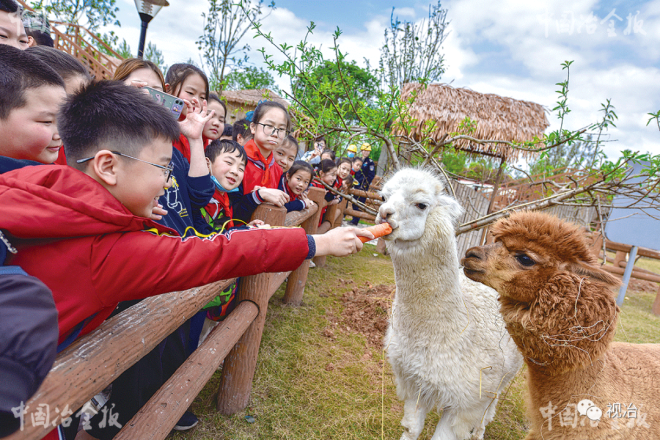 2021年4月9日,來自江西省萍鄉市高豐小學的180余名師生來到方大萍安鋼鐵進行研學之旅,這也是該公司工業旅游景區成為國家3A級旅游景區后接待的第一個超百人旅游團。圖為小學生們正在給羊駝喂食。(張韶濱 攝)