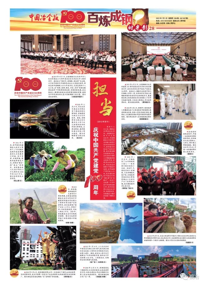 在中國共產黨成立100周年之際,中國冶金報特推出《時光影——建黨百年·百圖鋼鐵》欄目的“七一”特輯,并以《關懷》、《奠基》(1921年—1977年)、《騰飛》(1978年—2011年)、《奮進》(2012年至今)、《擔當》(2012年至今)5個主題篇章呈現,用視覺影像講述中國鋼鐵百年故事,以饗讀者!