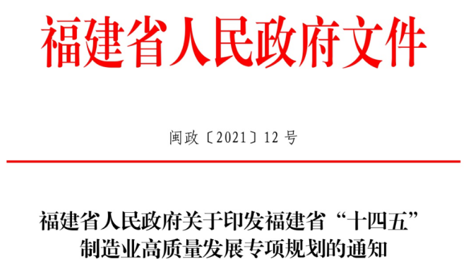 近日,福建省人民政府發(fā)布了《福建省人民政府關于印發(fā)福建省“十四五”制造業(yè)高質量發(fā)展專項規(guī)劃》(以下簡稱“《規(guī)劃》”)。