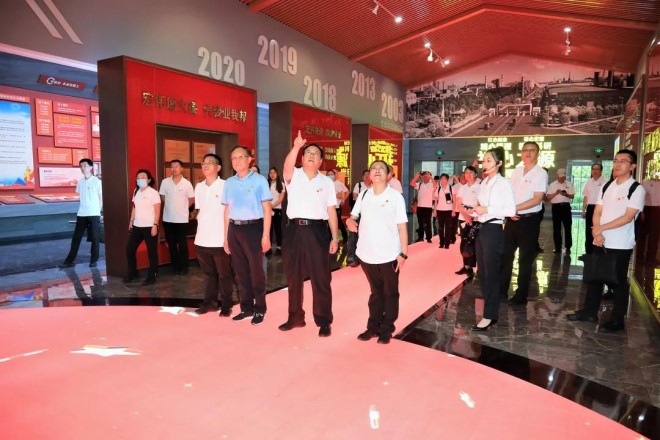 7月15日下午,全體人員首先參觀了宏興鋼鐵初心館。宏興鋼鐵2003年建立黨支部,2013年升格為黨總支,2018年升格為黨委,先后投入1.6億元建設(shè)了一批高水平黨群活動設(shè)施,其中包括以“點燃紅色引擎”為主題的宏興鋼鐵初心館。初心館中,大家認(rèn)真聆聽講解員對宏興鋼鐵多年來不忘初心、跨越發(fā)展歷程的講述,沉浸在一幅幅生動的圖片、一段段感人的故事中,了解獨具特色的宏興“好人文化”。
