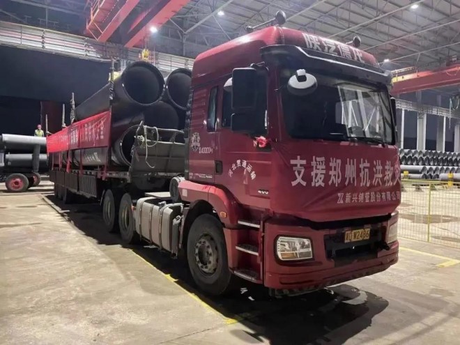此外,7月22日,新興鑄管鄭州銷售分公司接到鄭州自來水控股有限公司急需應急供水管材任務,立刻開展離心球墨鑄鐵管調配工作,聯系就近生產基地連夜發運所需管材。22日晚21點,鑄管管材從河北武安發運。
