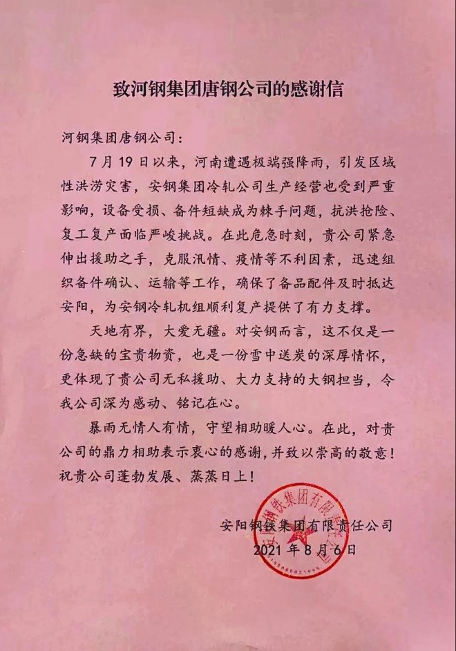 在此之際,安鋼特向河鋼集團(tuán)唐鋼公司發(fā)出感謝信,致以衷心的感謝和崇高的敬意!
