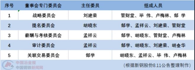 8月11日,新余鋼鐵發布公告,新余鋼鐵董事會選舉劉建榮先生為第九屆董事會董事長,選舉管財堂先生為第九屆董事會副董事長,選舉李文華先生擔任公司監事會主席,聘任管財堂先生擔任公司總經理,同意聘任廖鵬先生、畢偉先生為公司副總經理,同意聘任盧梅林先生為公司財務總監、董事會秘書(原董事會秘書李浩鳴先生因工作調整原因,已申請辭去董事會秘書職務)。