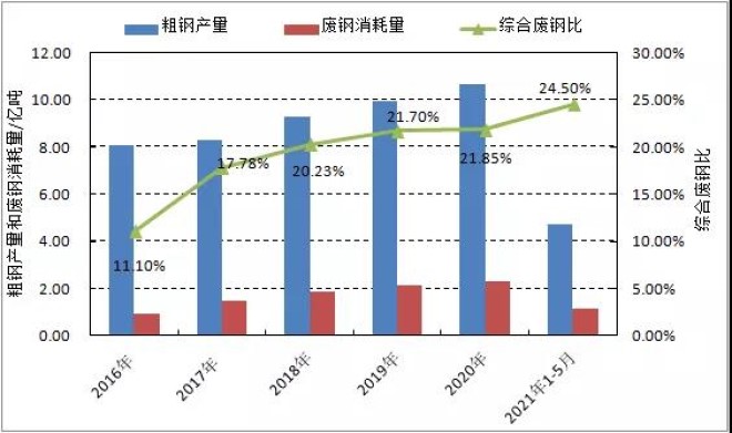 “十三五”期間,我國生鐵產量38.8億噸,比“十二五”增加4.1億噸,增幅11.9%;粗鋼產量46.3億噸,比“十二五”增加7.5億噸,增幅19.3%;煉鋼消耗廢鋼鐵8.74億噸,比“十二五”增加4.34億噸,增幅98.6%;廢鋼綜合單耗188.8千克/噸,比“十二五”增加75.4千克/噸,增幅66.5%(其中:轉爐鋼單耗139.7千克/噸,比“十二五”增加69.8千克/噸,增幅99.9%;電爐鋼單耗657.5千克/噸,比“十二五”增加53.9千克/噸,增幅8.9%;煉鋼廢鋼比18.88%,比“十二五”增加7.54個百分比;電爐鋼比9.5%比“十二五”增加1.3個百分比。