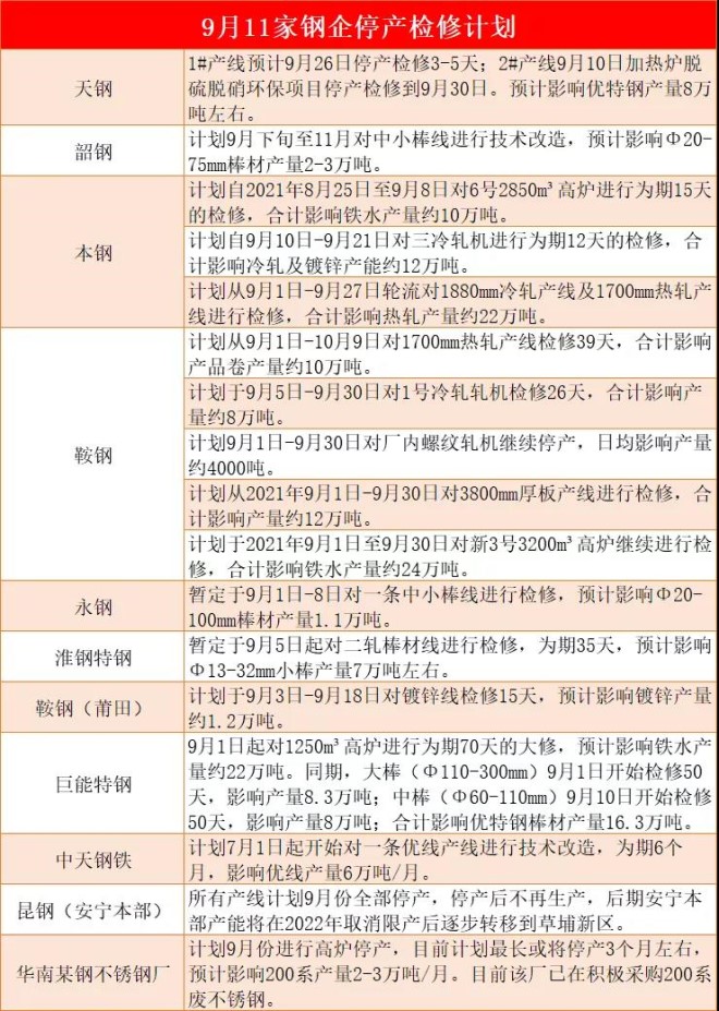 據不完全統計,截至8月30日已有11家鋼企發布停產檢修計劃,其中巨能特鋼9月1日起對1250m3高爐進行為期70天的大修,預計影響鐵水產量約22萬噸。同期,大棒(Φ110mm-Φ300mm)、中棒(Φ60mm-Φ110mm)自9月1日開始檢修50天,合計影響優特鋼棒材產量16.3萬噸。詳情如下: