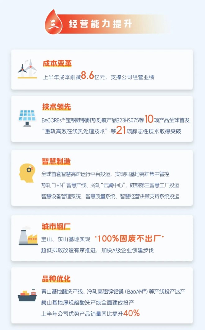 答:公司始終堅持精品發(fā)展戰(zhàn)略,產(chǎn)品聚焦于高技術(shù)含量、高附加值的碳鋼薄板、厚板與鋼管等精品,已形成了汽車用鋼、電工鋼、中高端長材、家電板、能源與重大工程用鋼、鍍錫板等全系列產(chǎn)品,公司自主研發(fā)的新一代汽車高強(qiáng)鋼、電工鋼、高等級家電用鋼、油氣管、橋梁用鋼、熱軋重軌等高端產(chǎn)品處于國際先進(jìn)水平。公司持續(xù)關(guān)注中國高端制造業(yè)如軍工、核電、高鐵、海工裝備、新能源汽車等產(chǎn)業(yè)的高速增長,規(guī)劃了包括超高強(qiáng)鋼、取向硅鋼與高牌號無取向硅鋼等在內(nèi)的高端產(chǎn)品研發(fā)與產(chǎn)線布局,并研發(fā)儲備更高端的新材料、新工藝技術(shù),上半年實(shí)現(xiàn)了BeCOREsTM 寶鋼硅鋼耐熱刻痕產(chǎn)品B23HS075等10項產(chǎn)品全球首發(fā)。