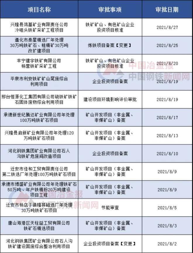 2021年8月,河北省共批復鐵礦石相關項目13個。