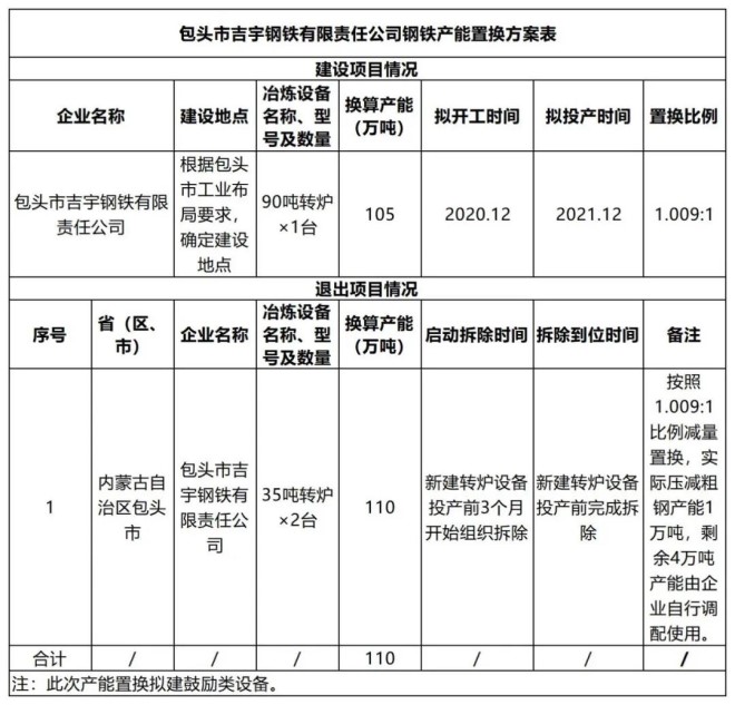 9月6日,內蒙古工業和信息化廳網站發布公告稱,為落實鋼鐵去產能“回頭看”檢查反饋意見,對包頭市大安鋼鐵有限責任公司(不含煉鐵)、包頭市吉宇鋼鐵有限責任公司已公告鋼鐵產能置換方案和內蒙古旭日鋼鐵有限公司已公示的產能置換方案予以撤銷,共涉及建設煉鋼產能320萬噸。
