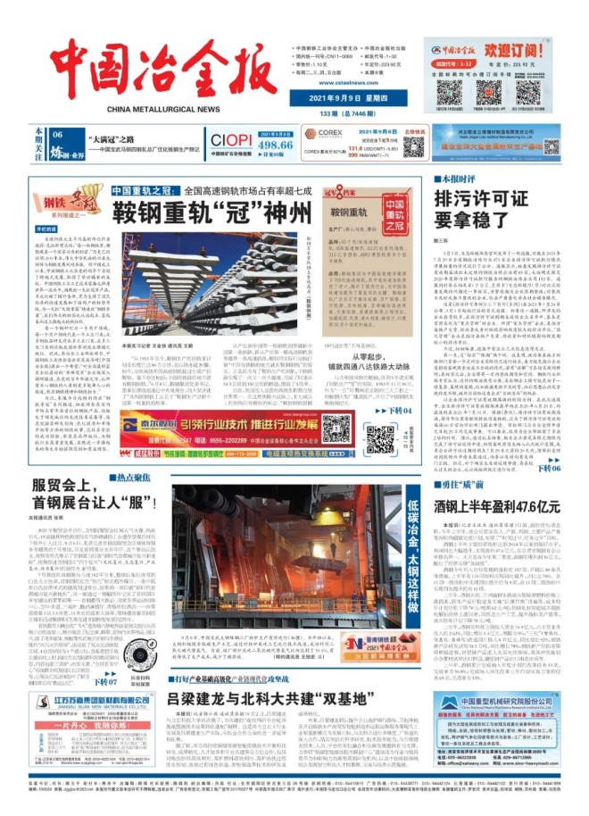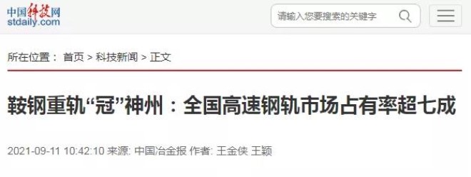 9月10日,中國科技網(wǎng)刊發(fā)了《鞍鋼重軌“冠”神州:全國高速鋼軌市場占有率超七成》一文,體現(xiàn)了對《中國冶金報》的《鋼鐵尋“冠”》系列報道的認可和重視,彰顯了我國鋼鐵企業(yè)的品牌地位,為鋼鐵行業(yè)高質(zhì)量發(fā)展實現(xiàn)進一步強起來的偉大目標(biāo)提供范例和有益借鑒。