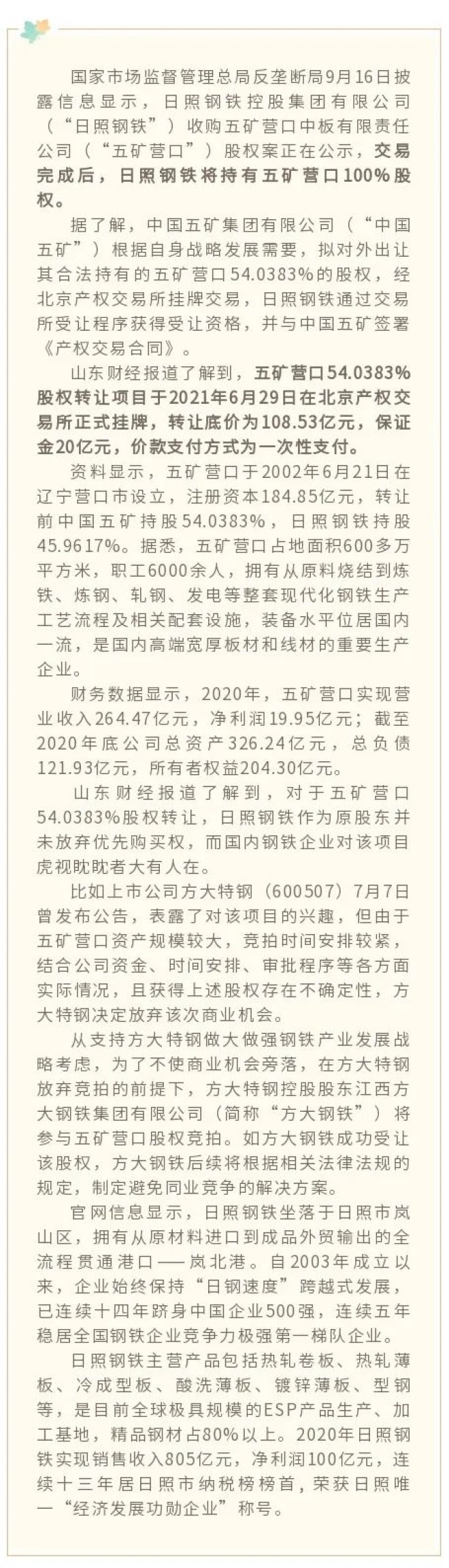日照鋼鐵收購五礦營口54.04%股權(quán)達(dá)到100%控股