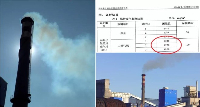 圖1 2021年9月1日,督察組現(xiàn)場(chǎng)檢查時(shí),吉林鑫達(dá)鋼鐵有限公司煉焦廢氣直排,二氧化硫濃度高達(dá)1928毫克/立方米,超標(biāo)18.3倍