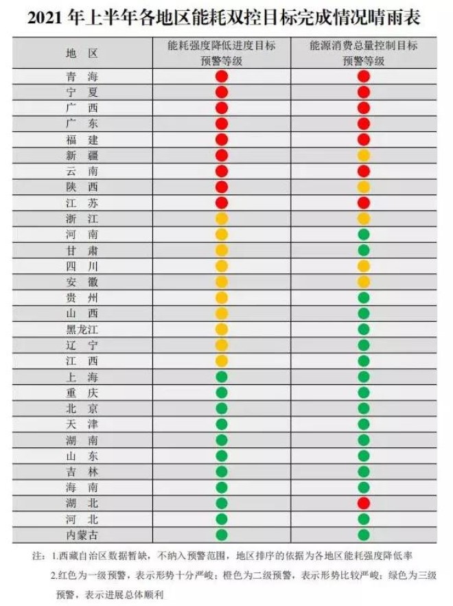 并且,8月底發(fā)改委也發(fā)布了《2021年上半年各地區(qū)能耗雙控目標(biāo)完成情況晴雨表》,對(duì)一級(jí)預(yù)警的省區(qū)提出新要求:對(duì)能耗強(qiáng)度不降反升的地區(qū)(地級(jí)市、州、盟),2021年暫停“兩高”項(xiàng)目節(jié)能審查(國(guó)家規(guī)劃布局的重大項(xiàng)目除外)。