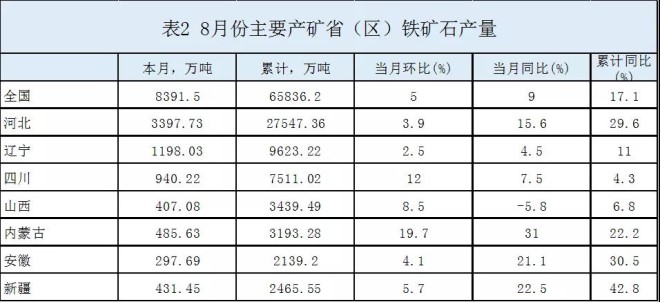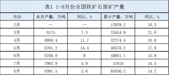 今年以來,我國(guó)鐵礦石產(chǎn)量明顯增長(zhǎng),月度產(chǎn)量始終保持較大幅度增長(zhǎng),累計(jì)產(chǎn)量始終保持兩位數(shù)增長(zhǎng)(見表1)。據(jù)國(guó)家統(tǒng)計(jì)局?jǐn)?shù)據(jù),8月份全國(guó)鐵礦石原礦產(chǎn)量為8391.5萬噸,同比增長(zhǎng)5.6%;1-8月份累計(jì)產(chǎn)量達(dá)6.58億噸,同比增長(zhǎng)14.2%,年化產(chǎn)量將達(dá)到9.87億噸,2018年以來首次接近10億噸。