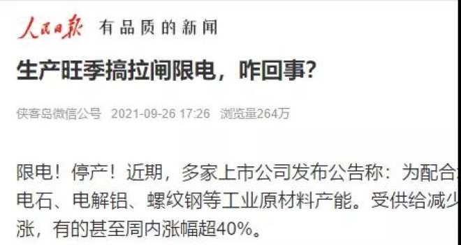 9月26日,人民日報俠客島微信公眾號刊發(fā)文章《生產(chǎn)旺季搞拉閘限電,咋回事?》,針對當(dāng)前限電、停產(chǎn)的熱點(diǎn)問題展開評論。