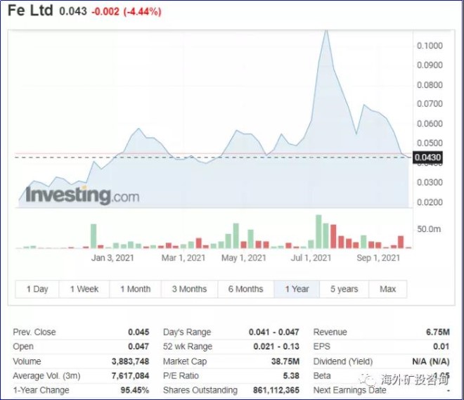 10月2日,Fe Limited (ASX:FEL) 公司(以下簡稱Fe公司)慶祝其成為澳大利亞最新的鐵礦出口商。Fe公司股價當天沒有上升,反而下跌4.44%,跌回到年初的股價,公司市值3800萬澳元。但公司一年股價仍然上升了95%。