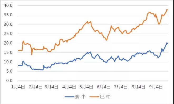 圖1 澳大利亞-中國和巴西到中國鐵礦石到岸成本構成(外環(huán):巴西-中國;內環(huán):澳大利亞-中國)
