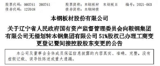 本鋼板材(000761)10月12日晚公告稱,公司近日收到本鋼集團通知,遼寧省國資委向鞍鋼集團無償劃轉本鋼集團51%股權事項已通過中國反壟斷審查及必要的中國境外反壟斷審查,并于10月12日辦理股東工商變更登記手續。