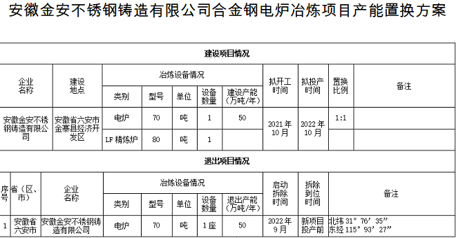 01安徽金安不銹鋼鑄造有限公司合金鋼電爐冶煉項(xiàng)目產(chǎn)能置換方案