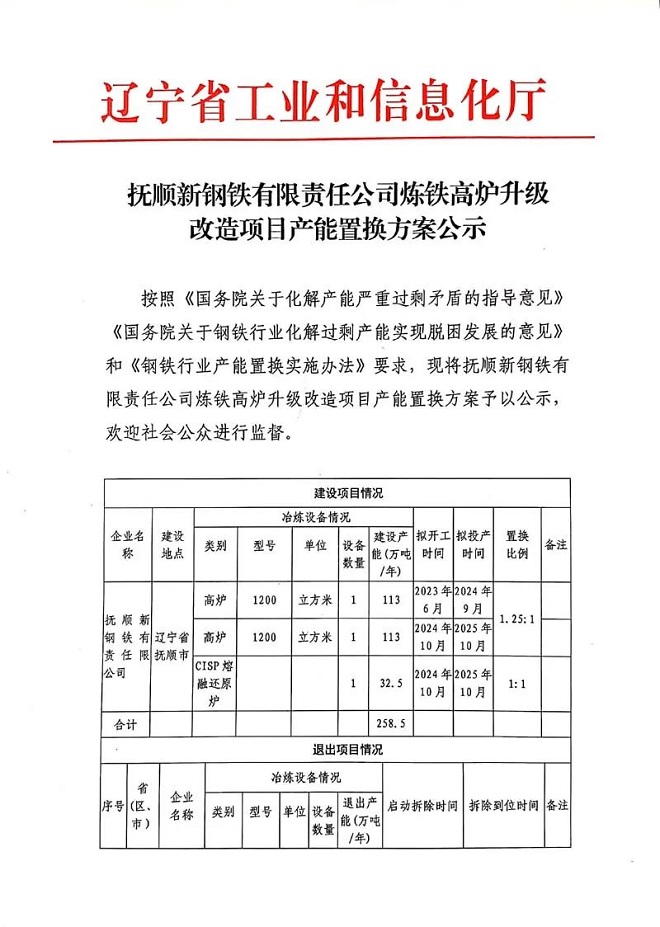 08撫順新鋼鐵煉鐵高爐升級改造項(xiàng)目產(chǎn)能置換方案