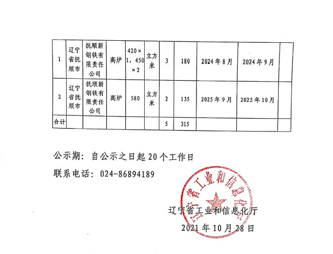 10月28日,遼寧省工信廳發(fā)布撫順新鋼鐵有限責(zé)任公司煉鐵高爐升級改造項(xiàng)目產(chǎn)能置換方案公示,其中,撫順新鋼鐵擬開工新建1200立方米高爐2座、CIP熔融還原爐1座,合計(jì)產(chǎn)能258.5萬噸。
