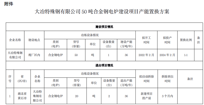 按照《國務(wù)院關(guān)于化解產(chǎn)能嚴(yán)重過剩矛盾的指導(dǎo)意見》《國務(wù)院關(guān)于鋼鐵行業(yè)化解過剩產(chǎn)能實(shí)現(xiàn)脫困發(fā)展的意見》和《鋼鐵行業(yè)產(chǎn)能能置換實(shí)施辦法》要求,經(jīng)企業(yè)申請,屬地工業(yè)和信息化部門審核,以及具有冶金專業(yè)甲級資信等級的第三方評估,現(xiàn)將大冶特殊鋼有限公司50噸合金鋼電爐建設(shè)項(xiàng)目產(chǎn)能置換方案予以公示。